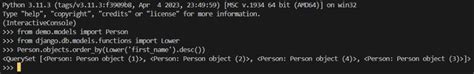 Person.objects.filter(username__lower__exact=search_term.less()) - Execute the question and procedure the outcomes.
